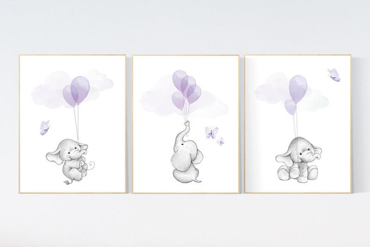 CANVAS LISTING: nursery decor girl purple, elephant nursery, lavender and gray, lilac, elephant balloons, butterflies