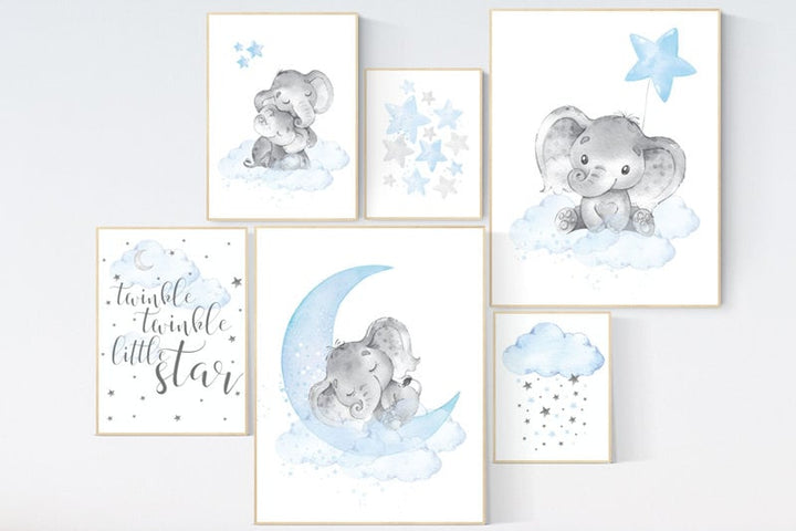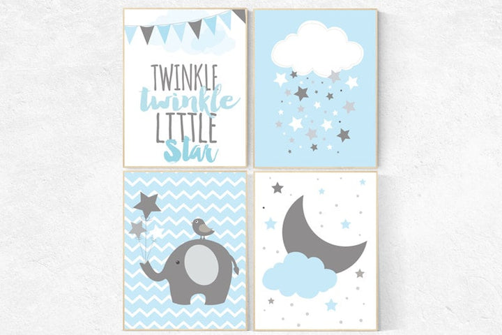 Elephant nursery, Twinkle Twinkle Little Star, cloud nursery art, Baby boy nursery decor, Blue gray nursery, boys room wall art, baby room