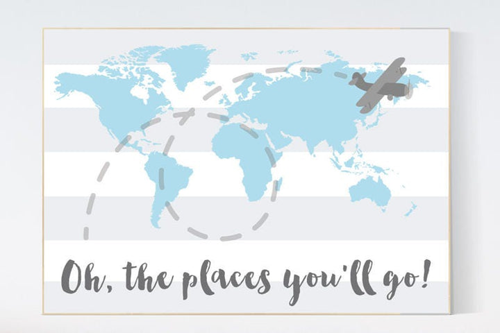 Oh the places you'll go, World Map wall art, world map nursery, Blue nursery decor, world map wall art, baby boy nursery, nursery decor boy