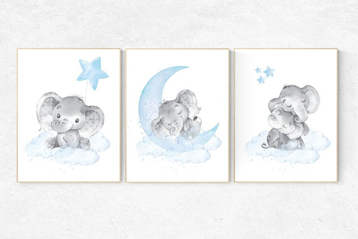 Nursery decor elephant, nursery wall art boy, Blue grey, cloud and stars nursery, elephant nursery art, moon nursery art, baby room wall art