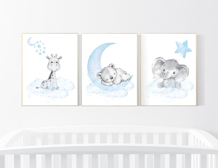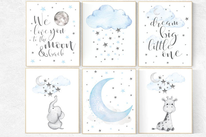 Nursery decor boy elephant, nursery wall art boy, moon and stars, nursery decor giraffe, elephant nursery art, Blue and gray, cloud nursery