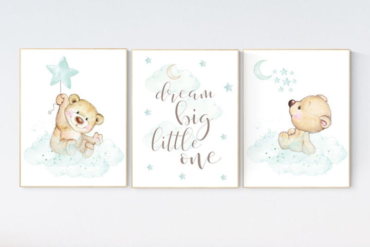 Mint nursery decor, nursery decor bear, teddy bear, gender neutral nursery, moon and stars, dream big little one, baby room art, mint green