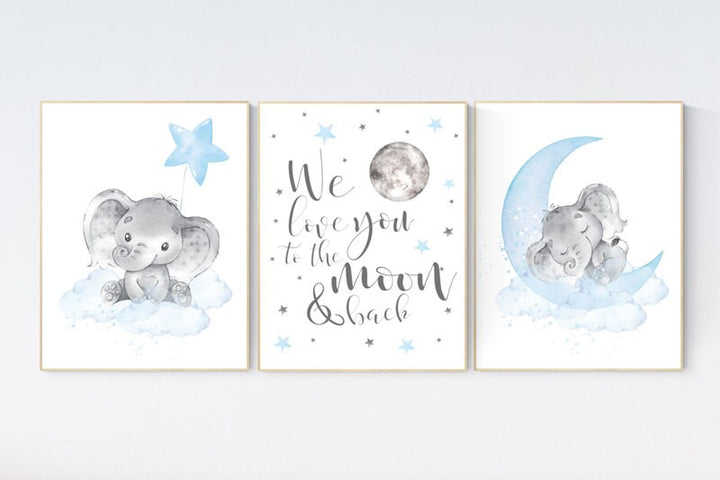 Nursery decor boy elephant, nursery wall art elephant, we love you to the moon and back, Elephant Nursery, boy nursery art, moon and stars