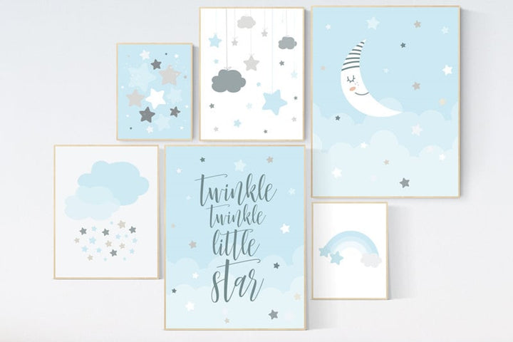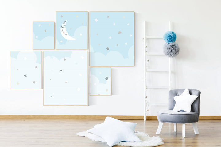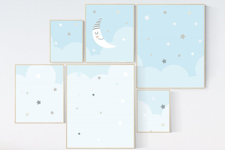 Nursery prints boy, nursery decor boy sky, sky nursery, baby room wall art boy, moon nursery art, moon and stars decor, baby blue room art