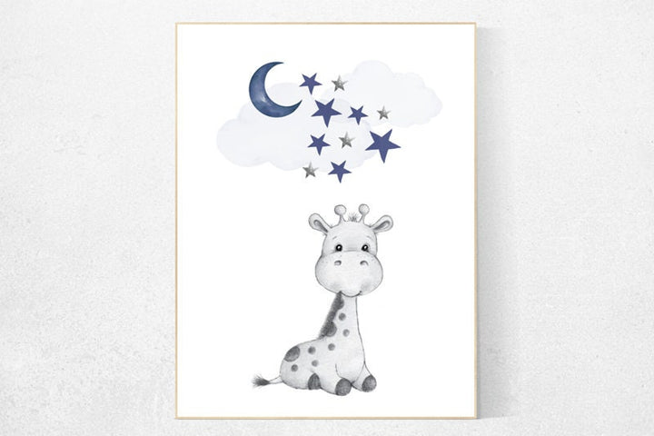 Nursery decor giraffe, navy nursery decor, cloud and stars, moon and stars, navy blue nursery art. baby room wall art, giraffe nursery