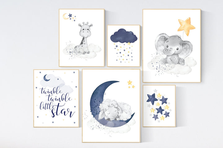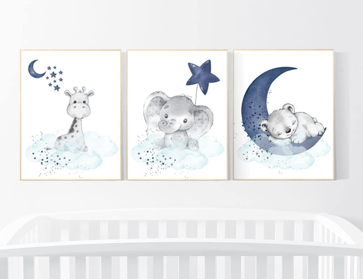 Nursery decor boy elephant, nursery wall art boy, moon and stars, navy blue, penguin, giraffe, navy nursery set, boys nursery wall decor