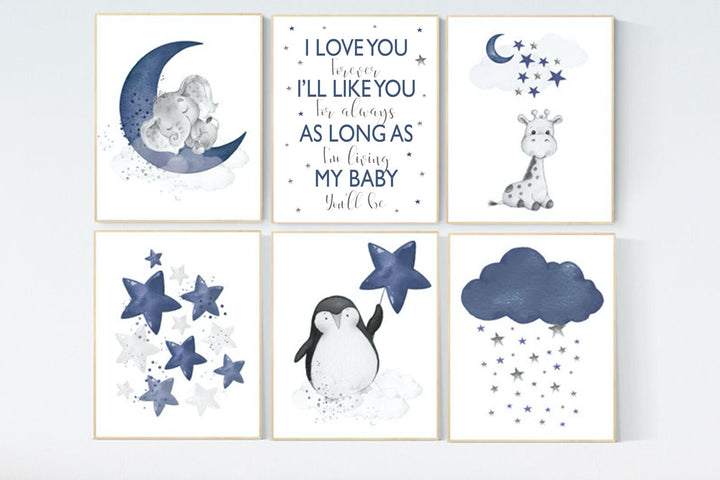 Nursery decor animals, giraffe, penguin, navy blue, baby room wall decor, animal prints, we love you to the moon and back, nursery art