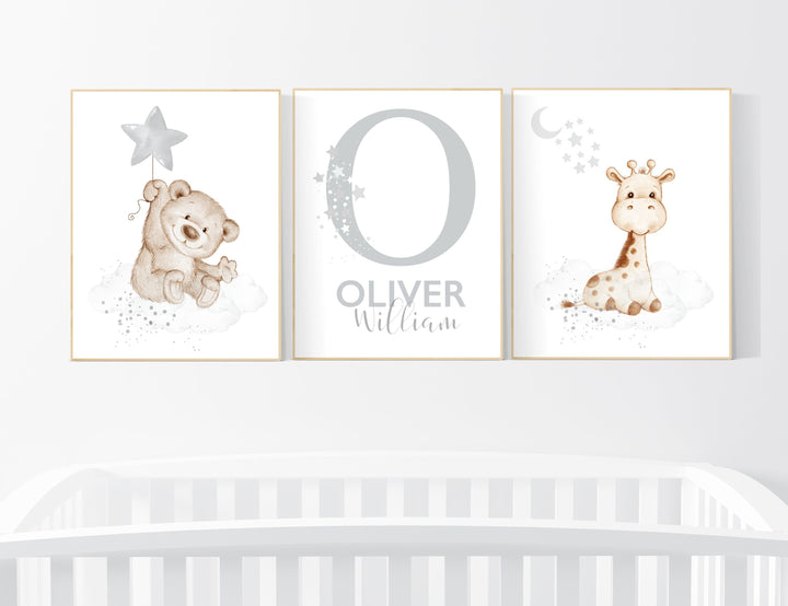 Nursery decor gender neutral, bear, giraffe, nursery wall decor, name nursery print, teddy bear decor, nursery wall art animals, boy nursery
