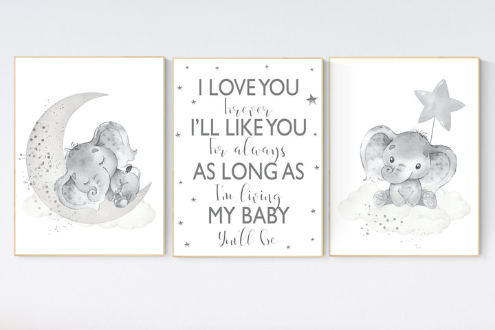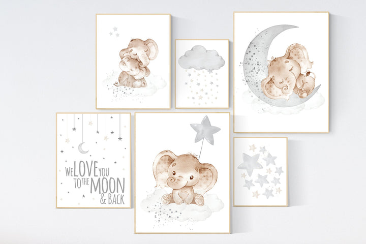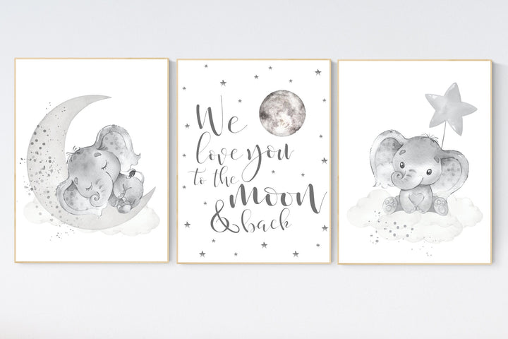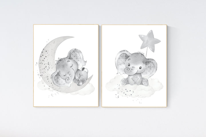 Grey nursery wall art, elephant nursery wall art, moon and stars, gender neutral, gray nursery art, baby room decor, neutral, twin nursery