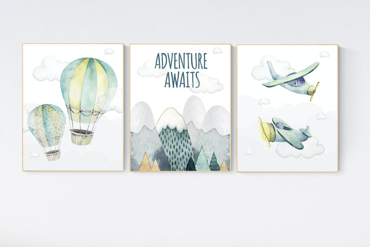 Nursery decor boy mountain, adventure nursery, travel theme nursery, woodland, gender neutral, adventure awaits, hot air balloon, plane