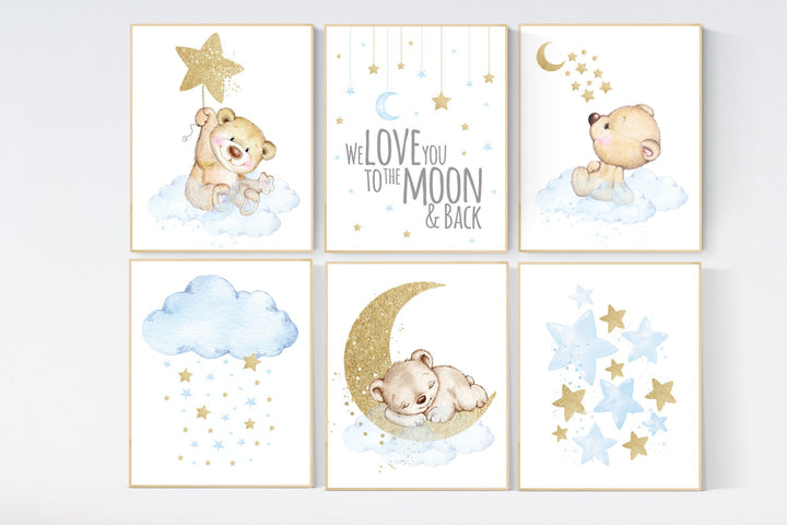 Nursery decor boy bear, boys nursery prints. nursery decor boy ideas, nursery art ideas, baby blue and gold, nursery wall art, blue gold