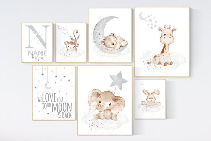 Nursery wall art animals, gray nursery, gender neutral nursery, neutral nursery, baby room decor, bear, elephant, giraffe, animal prints