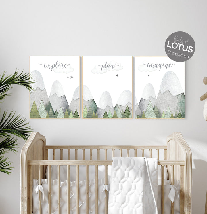 Nursery prints mountain, green nursery, adventure theme nursery, woodland nursery, gender neutral, explore, play, imagine, olive green