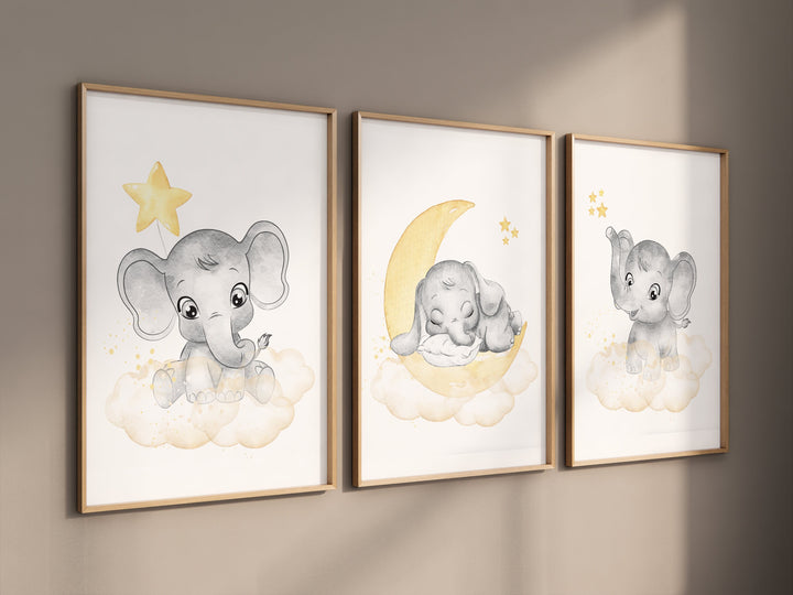 Nursery decor neutral, Yellow nursery, nursery wall art elephant, moon, stars, gender neutral, yellow and gray nursery art, baby room art