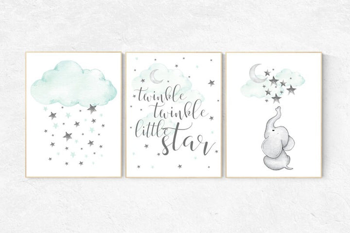 Elephant nursery decor, twinkle twinkle little star, Mint nursery decor, nursery decor neutral, nursery decor boy teal, cloud and star