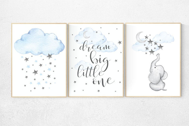 Nursery decor elephant, nursery wall art boy, Blue and gray, Nursery decor boy, dream big little one, clouds and stars, blue grey