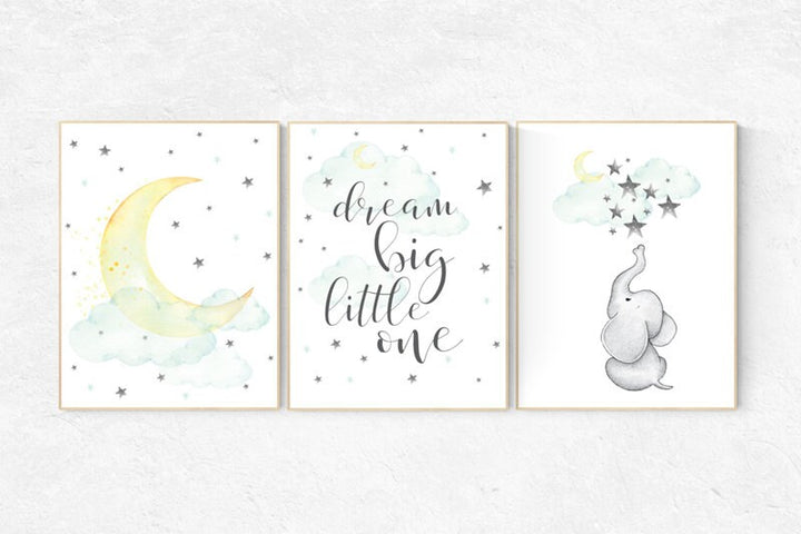 Mint and yellow nursery, nursery decor elephant, dream big, nursery decor neutral, nursery decor boy teal, cloud and star nursery, teal