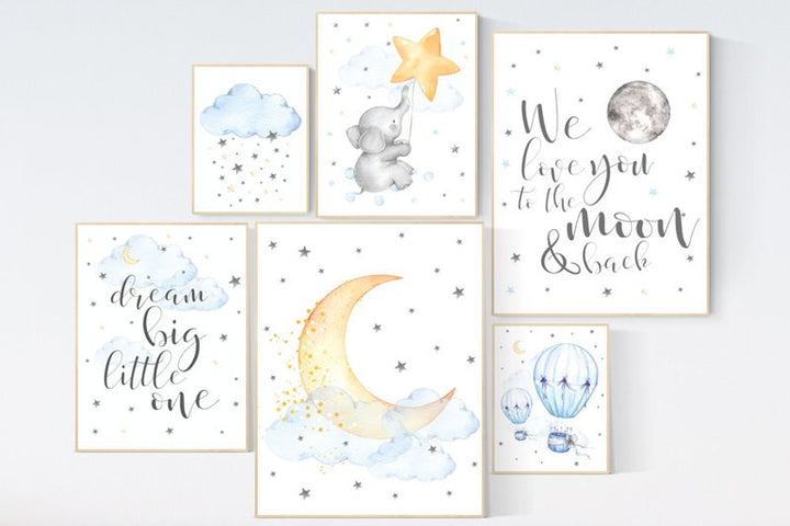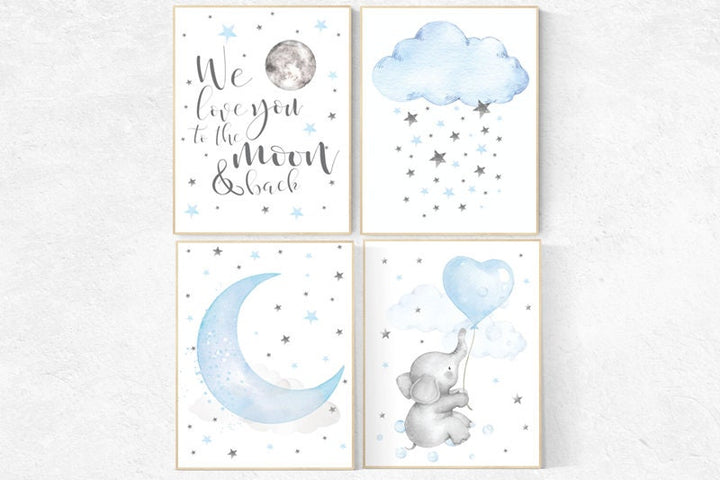 Nursery decor elephant, Nursery decor boy, nursery wall art, we love you to the moon and back, nursery art, blue nursery decor, cloud star