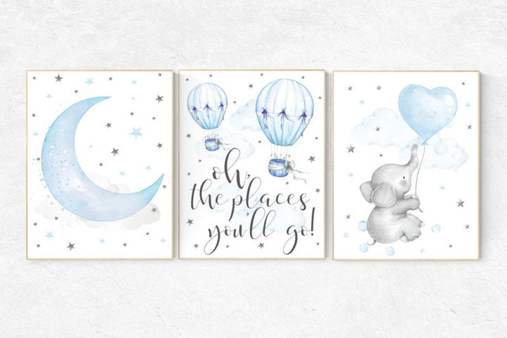 Nursery decor boy elephant, oh the places you'll go, navy nursery decor, cloud and stars, hot air balloon, navy blue nursery art. baby room