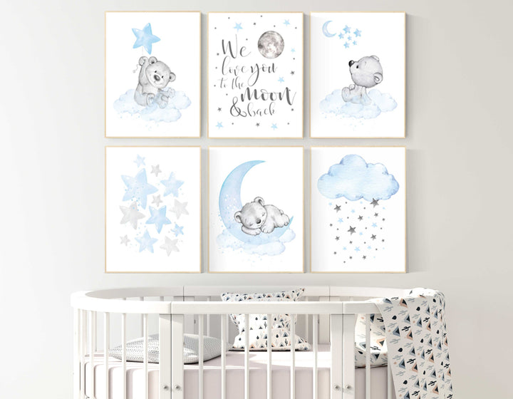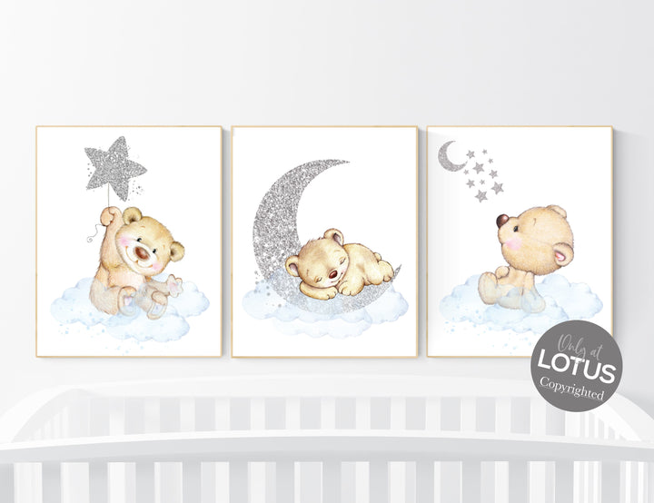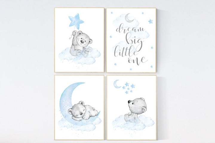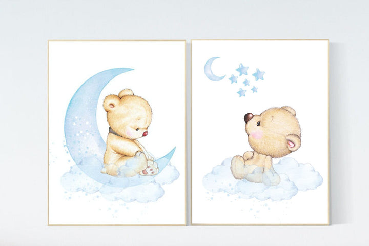 Nursery wall art bear, boys nursery prints. nursery decor boy ideas, nursery art ideas, baby blue, grey, nursery wall art, sky, moon, stars
