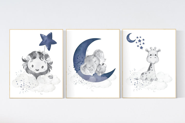 Lion, elephant and giraffe, Navy nursery decor, moon and stars, navy blue nursery art. baby room wall art, boy nursery decor, set of 3