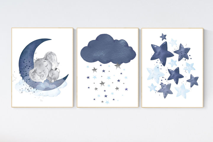 Navy nursery decor, moon and stars, navy blue nursery art. baby room wall art, boy nursery decor, set of 3, nursery prints boy, elephant art