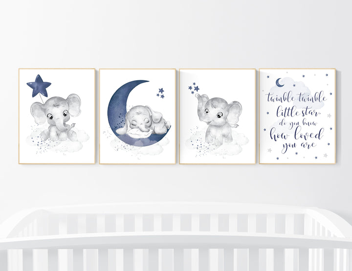 Nursery decor boy elephant, navy nursery decor, moon and stars, navy blue nursery art, elephant, boy nursery, twinkle twinkle little star