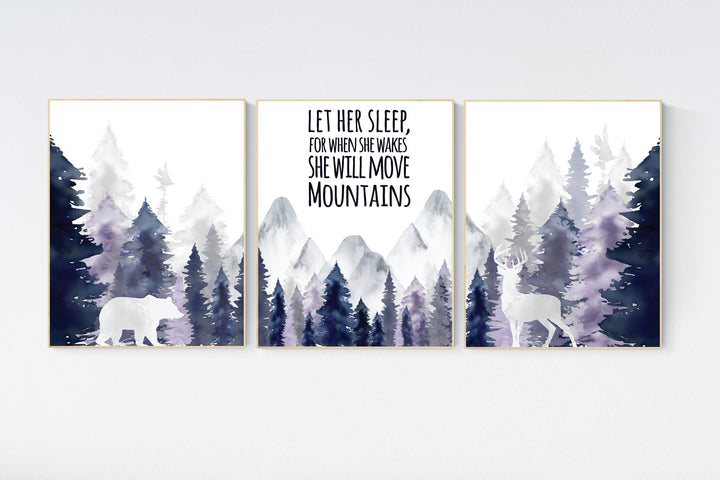 Nursery decor woodland, mountain wall art, tree nursery decor, adventure theme nursery, forest, navy, purple nursery, woodland animals