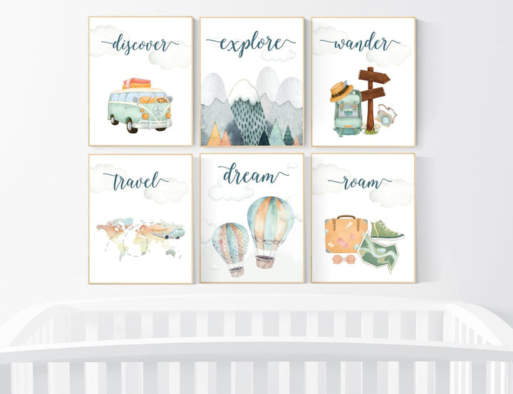 CANVAS LISTING: Travel nursery print, Explore nursery wall art, Baby boy nursery, Adventure Set of 6 prints, Camping Prints