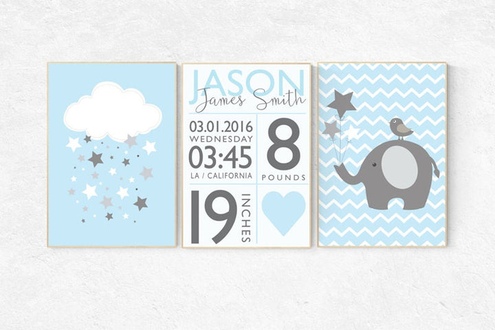 Nursery decor boys elephant, blue and gray nursery, nursery wall art boy, nursery wall art elephant, nursery prints elephant, birth stats