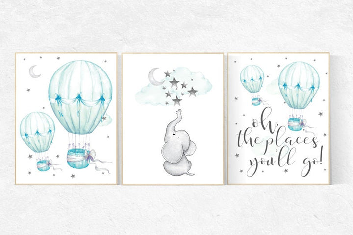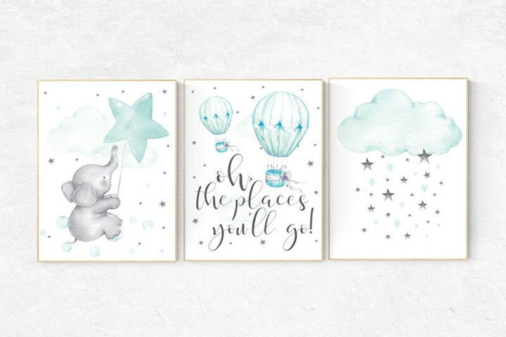 Mint nursery decor, nursery decor elephant, hot air balloon, gender neutral nursery, oh the places you'll go, mint green nursery wall art
