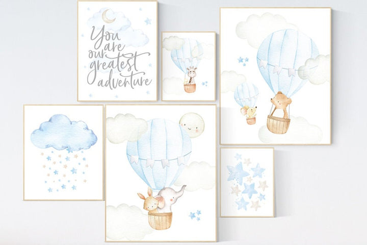 Nursery decor boy travel, you are our greatest adventure hot air balloon, nursery wall art animals, moon and stars, baby blue nursery art