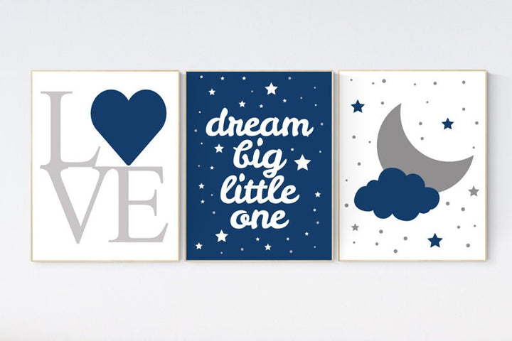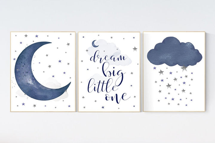 Nursery decor boy, navy nursery decor, moon and stars, dream big little one, navy blue nursery art, baby boy nursery art, raindrops