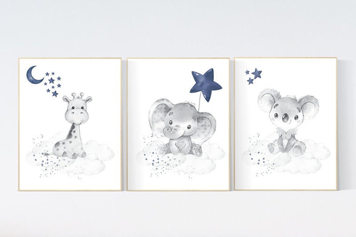 Nursery decor elephant and giraffe, animal nursery prints, koala nursery, navy nursery, navy blue nursery, baby room wall art, woodland