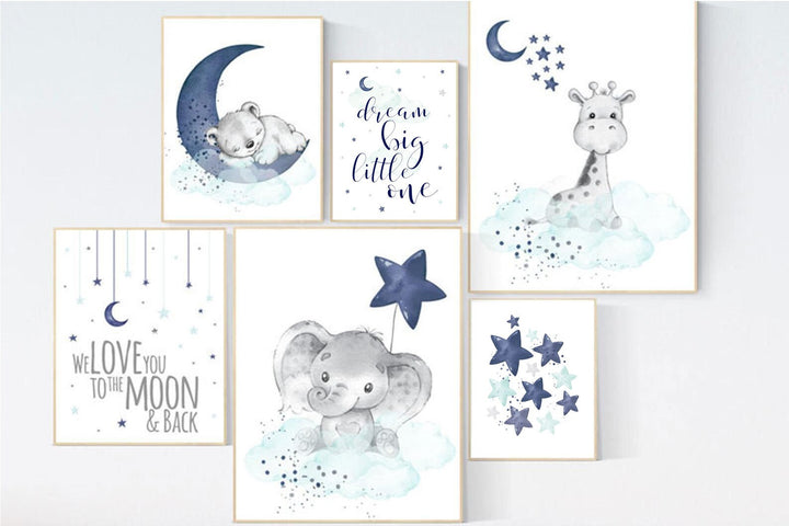 Nursery decor boy elephant, giraffe, boy nursery decor, moon and stars, navy teal nursery, boy nursery, we love you to the moon and back