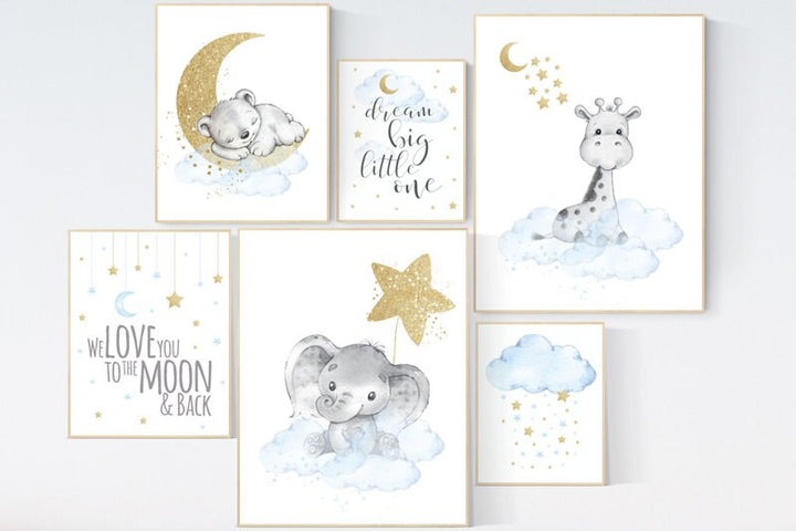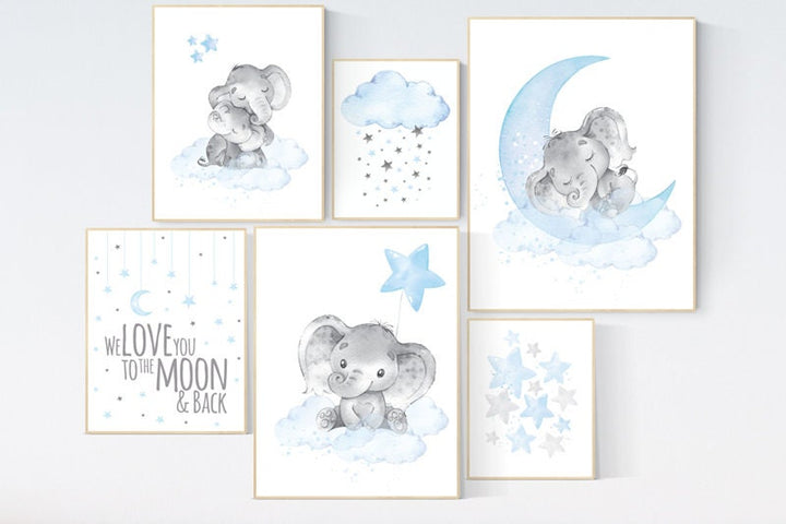 Nursery decor elephant, nursery wall art boy, Blue grey, cloud and stars nursery, elephant nursery art, moon nursery art, baby room wall art