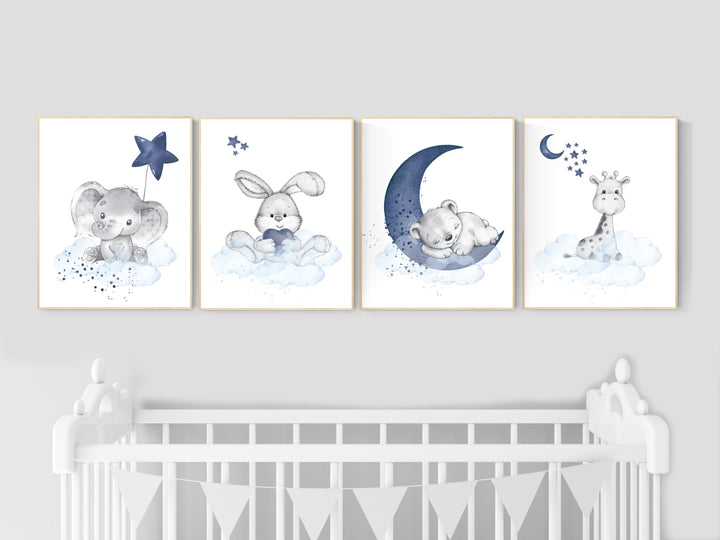 Nursery decor animals, giraffe, elephant, bunny, bear, animal nursery prints, navy blue nursery, baby room wall decor, woodland animal