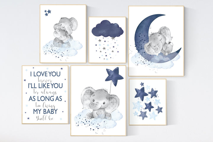 Nursery decor boy elephant, nursery wall art boy, navy Blue, moon and stars, navy nursery, boy nursery decor, elephant nursery art, star