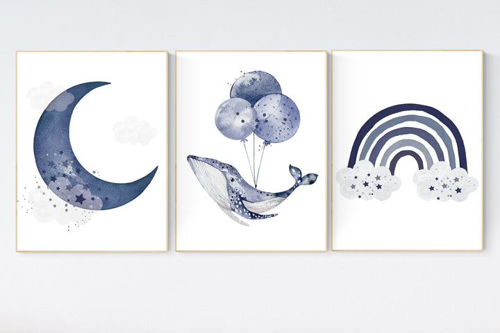 Navy nursery decor, whale nursery, cloud and stars, moon and stars, navy nursery art, baby room wall art, boy nursery decor, set of 3