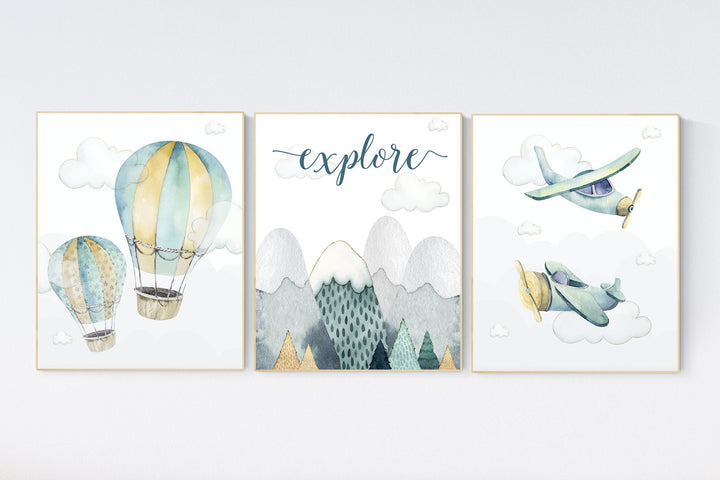 Nursery decor boy mountain, adventure nursery, travel theme nursery, woodland, gender neutral, explore, hot air balloon, plane, neutral