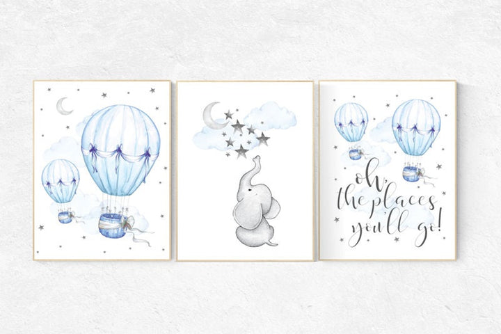 Nursery wall art elephant, Nursery decor boy hot air balloon, oh the places you'll go, hot air balloon nursery, blue and gray nursery