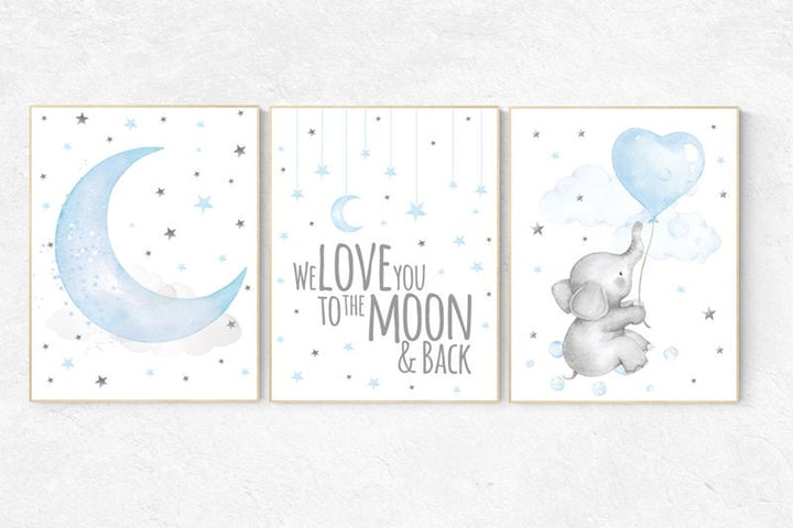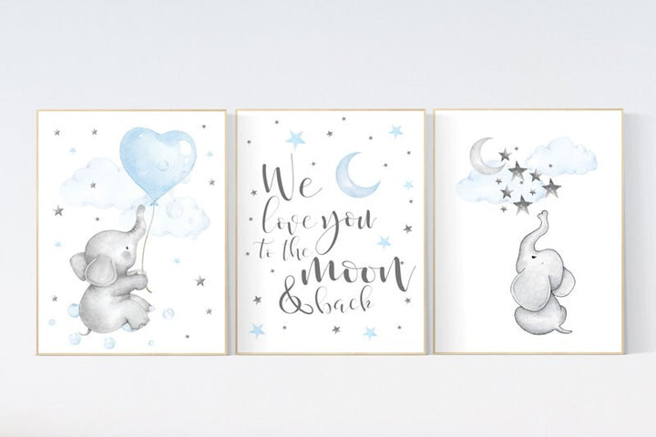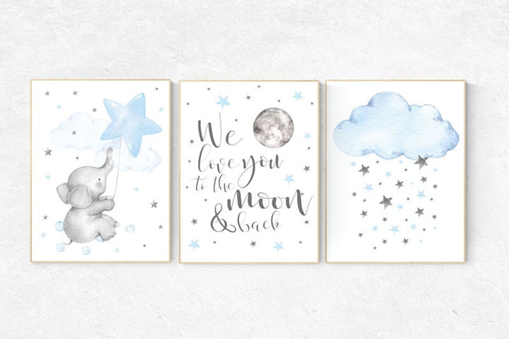 Elephant nursery, we love you to the moon and back, Blue and gray, Nursery decor boy, nursery decor, boys room, clouds and stars, blue grey