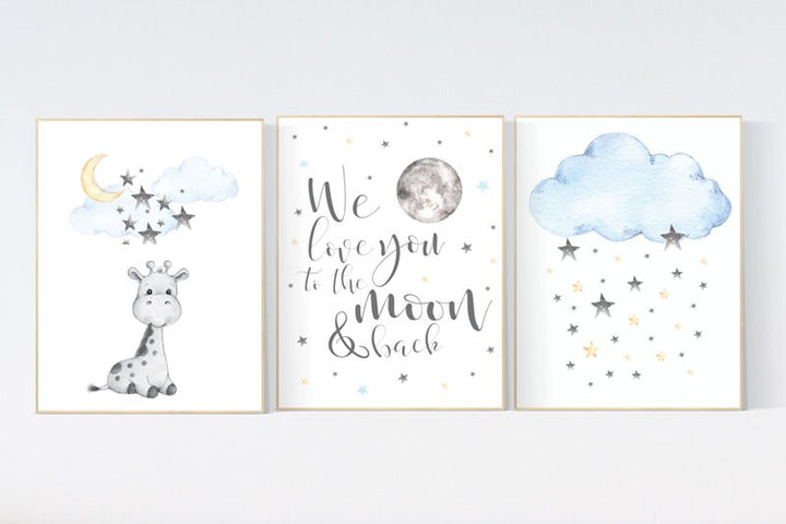 Nursery wall art giraffe, nursery decor neutral, we love you to the moon and back, moon and stars, gender neutral, blue yellow baby room