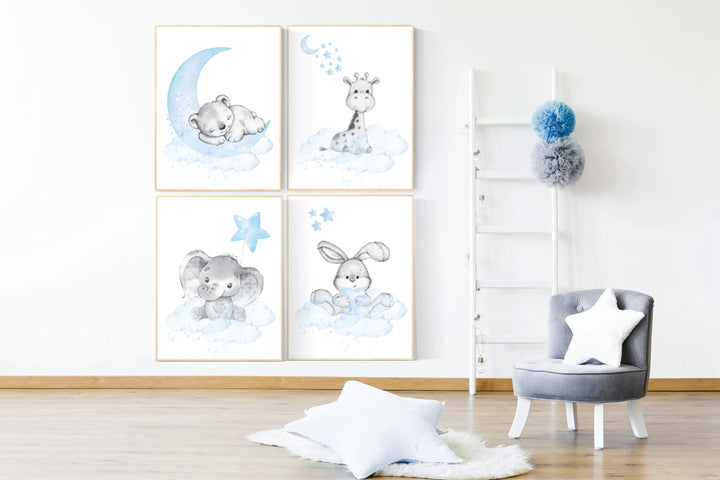 Nursery decor boy elephant, animal nursery, bunny nursery art, baby blue, bear nursery, giraffe baby room wall art