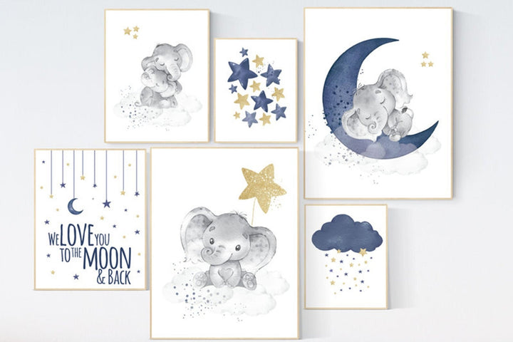 Nursery decor boy elephant, nursery wall art boy, navy Blue gold, moon and stars, navy nursery, boy nursery decor, elephant nursery art