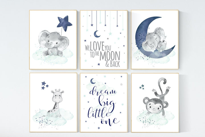 Nursery decor boy animals, nursery wall art boy, navy teal, moon and stars, navy and teal, elephant, giraffe, monkey, nursery wall decor