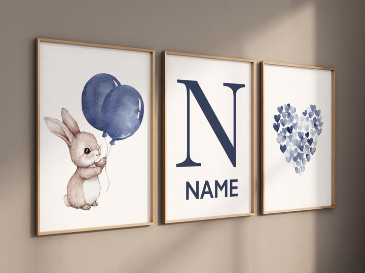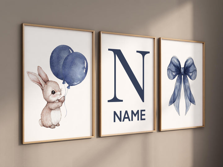 navy rabbit wall art, bunny balloon nursery print, watercolor blue bunny, personalized baby name poster, gender-neutral nursery decor