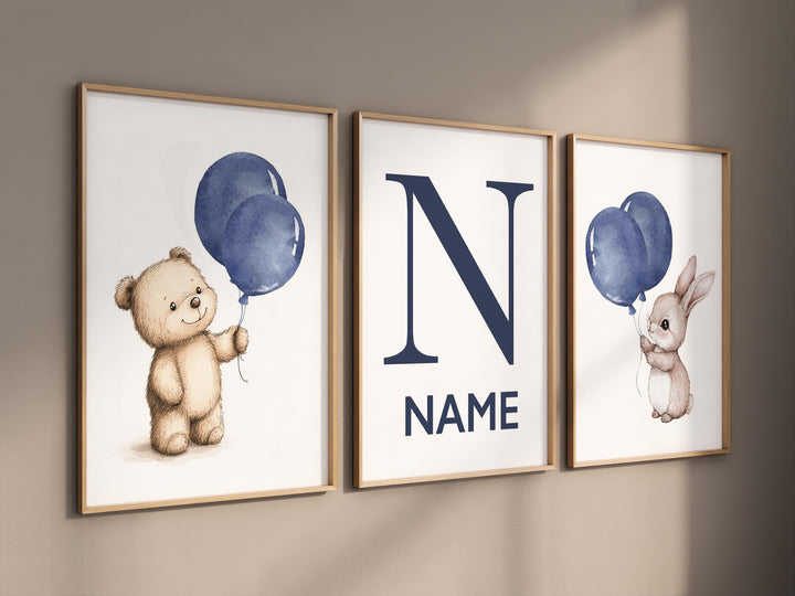 Navy balloon nursery art, bear and bunny print, personalized baby name poster, blue animal wall decor, gender-neutral nursery artwork