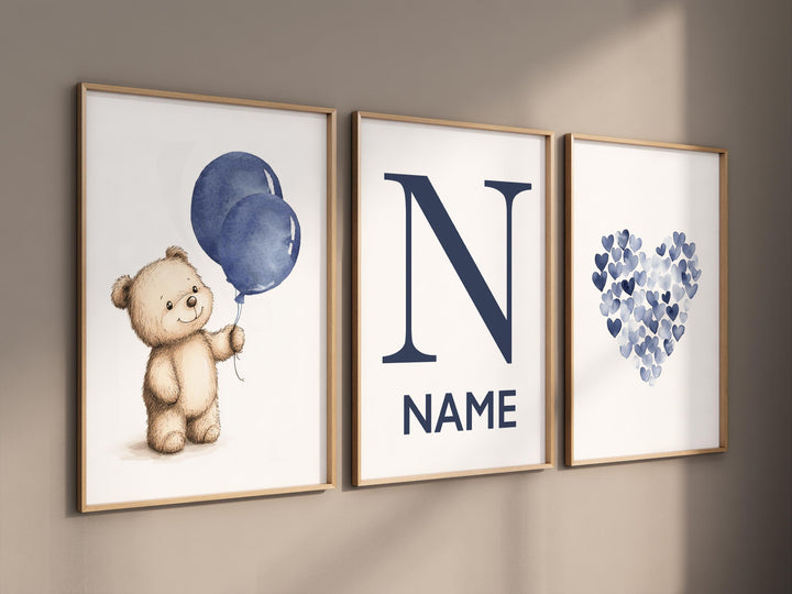 Navy bear wall art, boy nursery balloon prints, custom name nursery decor, blue heart wall art, baby boy room prints, navy blue nursery set