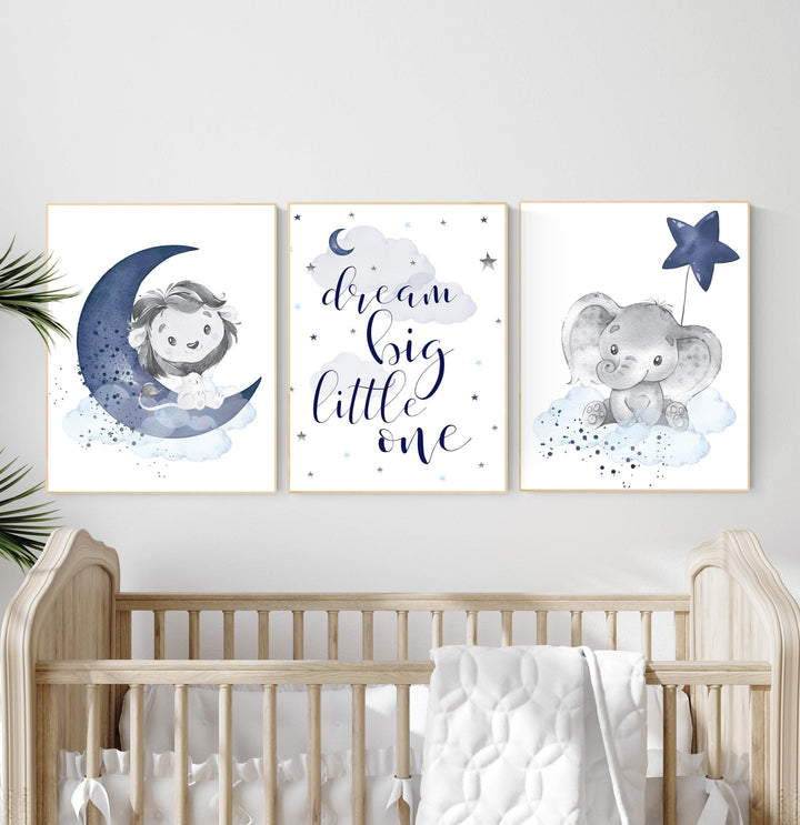 Boy Safari Nursery Wall Art Set – Dream Big Little One Lion Elephant Moon Star, Blue Animal Prints, Baby Boy Room Decor, Safari Theme